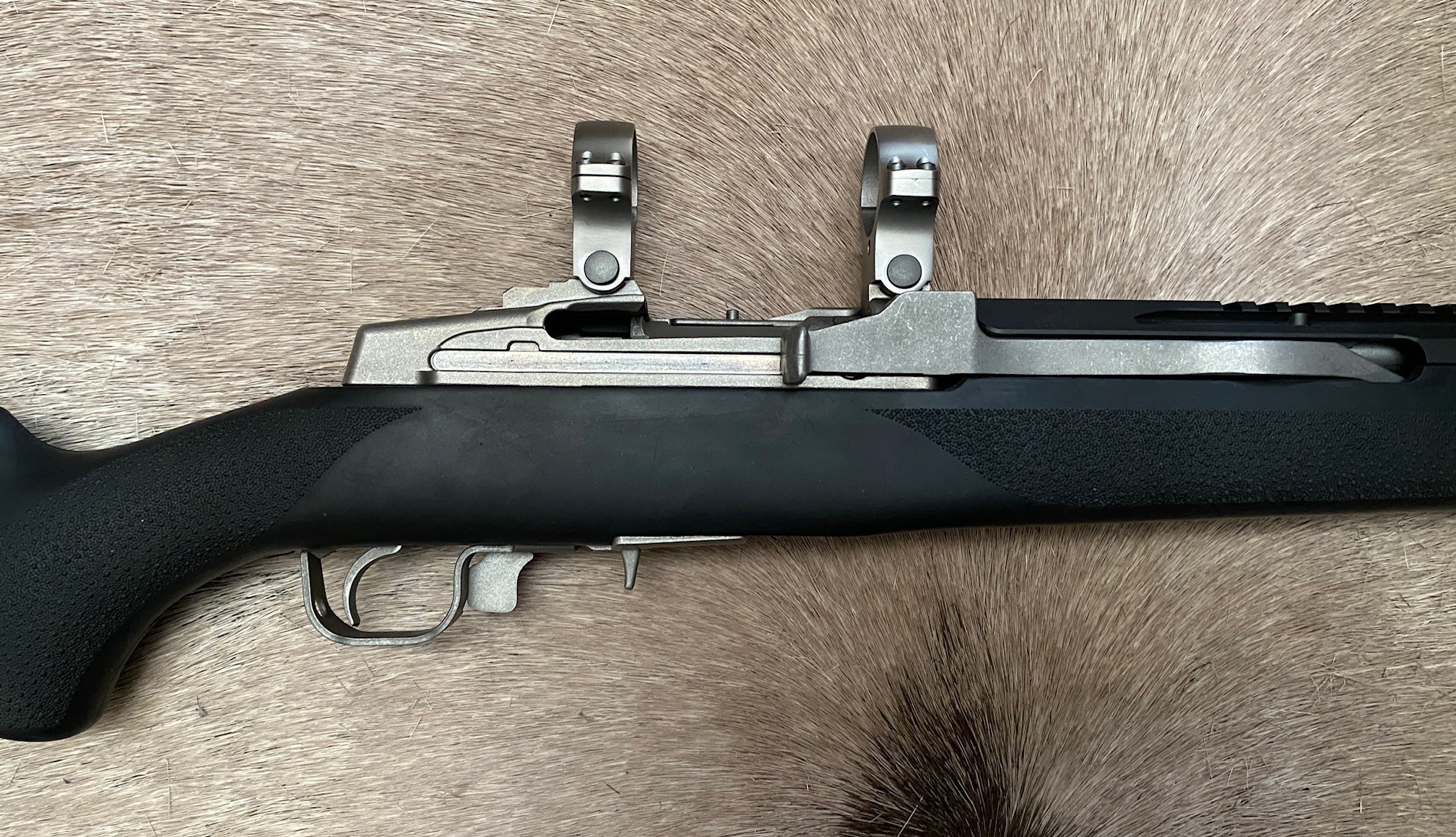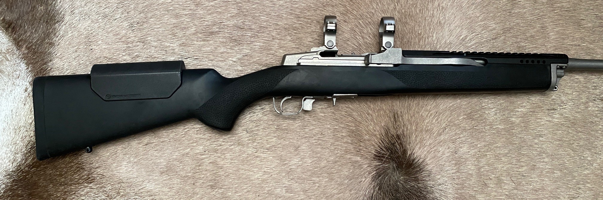 RUGER Mini-14 Stainless Ranch .223 This 580 Series Mini-14 was set up for the night time hunting of coyotes. The sights were removed and the 17.5" barrel was threaded 1/2-28 for suppressor use. A picatinny hand guard was installed and the front fixed swivel loop was removed and the swivel head modified for QD style swivels. Extra high 30mm stainless steel rings were used to allow a clip-on thermal to clear the forend. A cheekpiece riser was installed to align with higher scope position. The gun shoots Underwood 62 grain "Controlled Chaos" ammunition very well. The gun is in great shape and worked very well, its just looking for a new home as a 22ARC bolt gun took its place. Factory box and a couple 5 round mags are included. Priced to sell with upgrades, as is.