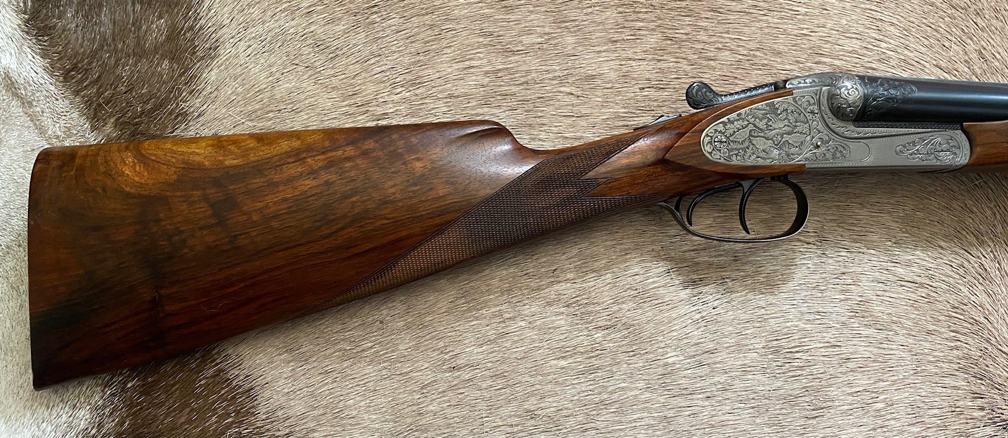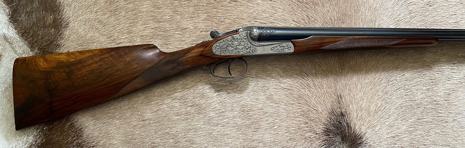 Adamy - 16ga. Side by Side. Made in Germany @ 2001. This game scene engraved sideplated non-ejector boxlock has cocking indicators, 28" barrels and 2 3/4” chambers. Choked .004" SKT & .009" Light Modified. European walnut stock with straight English stock with checkered butt and semi-beavertail forend. Length of Pull: 14 11/16". Drop at Comb: 1 3/8". Drop at Heel: 2 3/8". Cast: Off 3/16". 6 3/4 pounds.