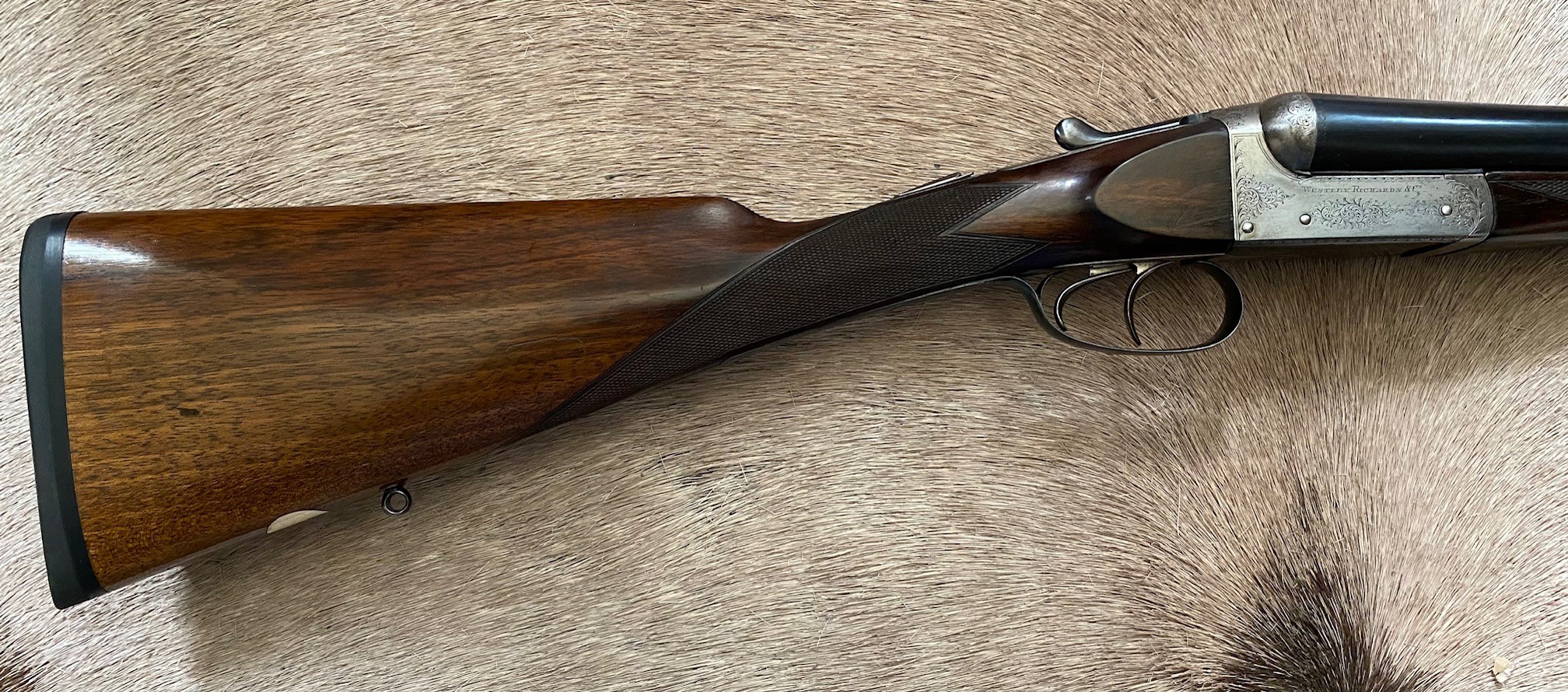 Westley Richard’s & Co. - Boxlock - 12 Gauge. This Birmingham built gun has 30" barrels, ejectors and loop swivels. The barrels are choked .001" / Cylinder & .013" Light Modified with 2 3/4" chambers. The straight grained stock has a Length of Pull: 14 3/16" which includes the .500" Black recoil pad. Drop at Comb: 1 1/2". Drop at Heel: 2". Cast: Off 1/4". 6.5 pounds.