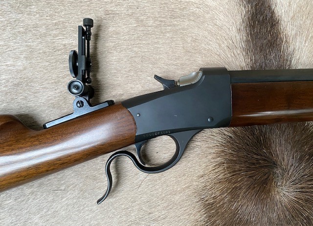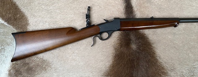 Winchester 1885 - .22LR Miroku made 1885 in excellent condition. 24" half-octagon / half-round barrel. Gun is outfitted with Montana Vintage Arms #130 Vernier Tang Sight, Lee Shaver globe front sight and MVA bubble level in rear sight dovetail. I configured this rifle to replicate one I grew up with, now its time for it to find a new home. The gun loves Federal Gold Medal Match.